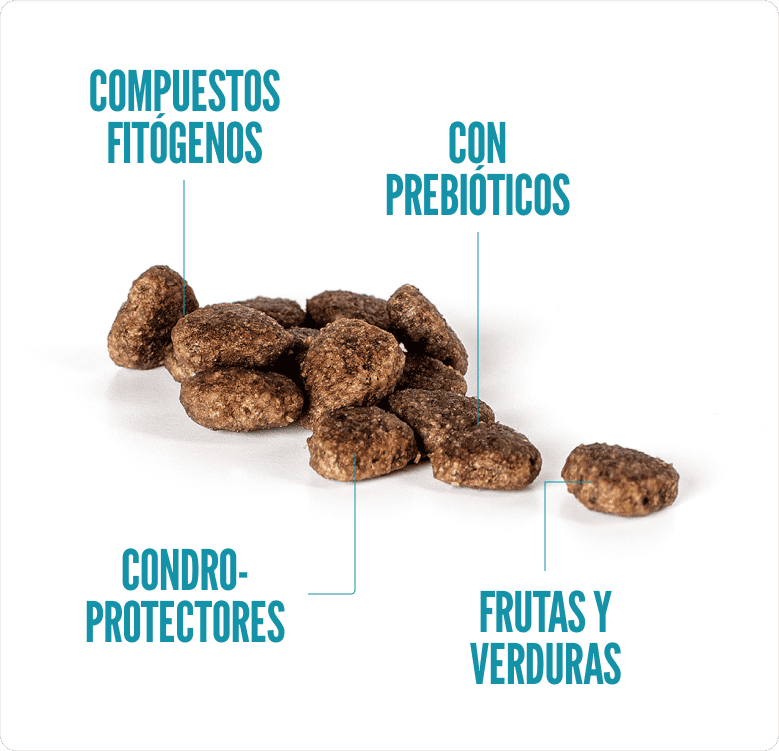 Harina de pollo (30%), trigo, arroz (10%), maíz, harina de pescado, grasa de pollo, levadura, hígado de pollo hidrolizado, fibra de celulosa, pulpa de remolacha, pulpa de achicoria (FOS), aceite de salmón, huevo entero deshidratado, manzana, sal, cloruro de potasio, romero, agrimonia, Yucca schidigera.