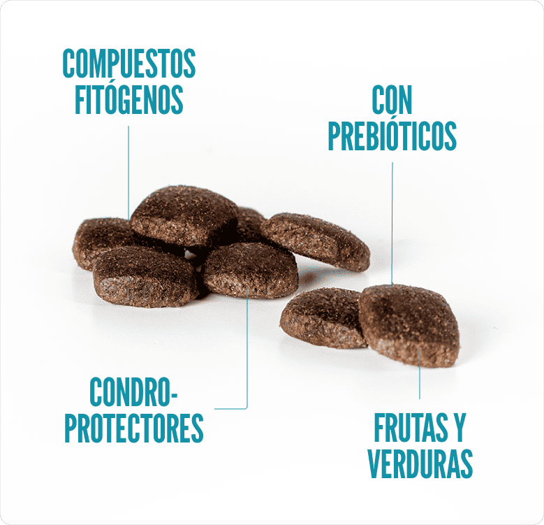 Harina de pollo (35%), maíz, arroz (14%), grasa de pollo, trigo, harina de pescado, linaza, pulpa de remolacha, hígado de pollo hidrolizado, pulpa de achicoria (FOS), levadura, huevo entero deshidratado, tomate, manzana, sal, cloruro de potasio, romero, agrimonia, extracto de levadura (MOS), glucosamina, sulfato de condroitina, Yucca schidigera.